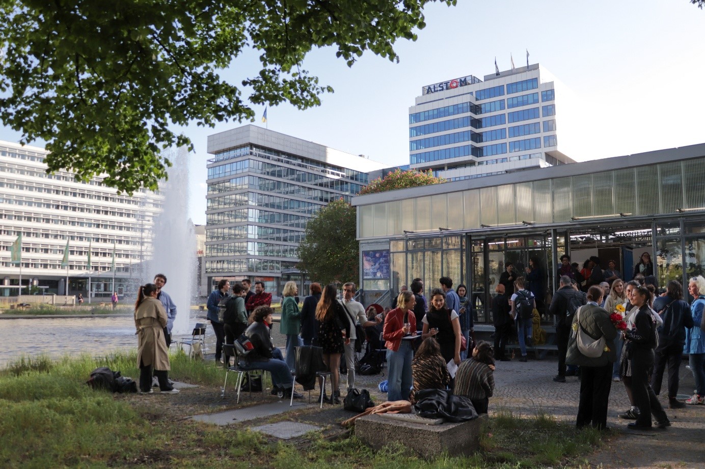 The vernissage was a great success, certainly supported by the beautiful location and sunny weather we were lucky to enjoy. Over the course of the evening, the venue itself became a hot topic of conversation. The BHROX: the quiet, surprisingly acoustically pleasant island is settled within a roundabout, circled by (as is typical of Berlin) multiple lanes of traffic connecting major throughways. Surrounded by flowing fountains, shaded by vibrant trees, and housed in a glass pavilion, the BHROX felt like an oasis in a concrete desert—even in the midst of rush hour.