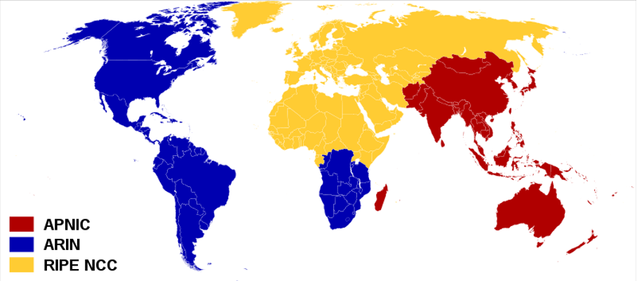 Figure 2: Regional Internet Registries before the creation of LACNIC and AFRINIC (Wikipedia, CC BY-SA 3.0)