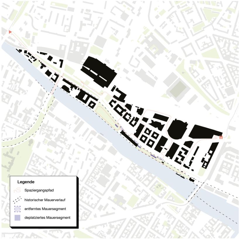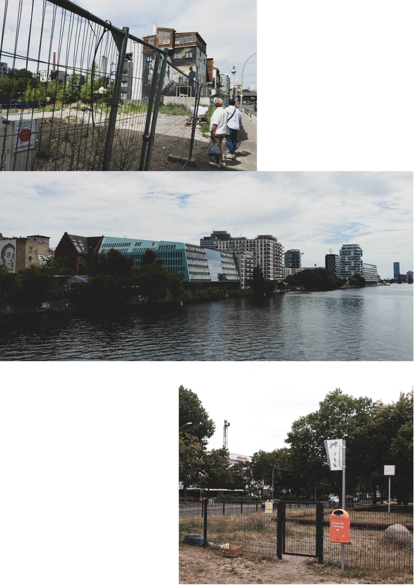 Ich beginne meinen Spaziergang nicht an der Schillingbrücke, sondern flussabwärts an der Michaelbrücke an einem wechselhaften Donnerstagmittag im Sommer 2022. Die Mauer verlief hier nicht entlang, sondern auf der diesseitigen Uferseite von der Schilling- bis zur Oberbaumbrücke. Ich realisiere, dass ich die Strecke bis zur Oberbaumbrücke allenfalls mit dem Auto oder Fahrrad transitiert bin, nicht jedoch per pedes. Die in beide Fahrtrichtungen zweispurige Straße mit Mittelstreifen führt mich an einem weiß verkleideten Zaun entlang und preist sich als Graffiti-Visitenkarte an. Plötzlich erschließt sich mir jedoch die Verkleidung: Ein Restaurant kündigt sich durch den verspielten Eingang im typischen ›Berliner Bretterverschlag-Club-Stil‹ an und ist der Bar25/ Kater zuzuordnen, die nebenan auf dem ehemaligen BSR-Grundstück den ›Holzmarkt 25‹ etablierten. Im Schatten der Stadtbahnbrücke wird mir die Frequenz des fließenden Verkehrs bewusst, denn der Resonanzkörper verstärkt jedes Motoren- und Reifenabrollgeräusch. Wieder unter ›freiem Himmel‹ erkenne ich am Horizont schon die Hochhausbaustellen. Die mit Wandgemälden versehenen Architekturen des Holzmarktes durchbrechen den ausgrenzenden (verkehrs-)infrastrukturellen Charakter der Umgebung: Verkehrsflächen, Tankstelle, Autowaschanlage sowie Gasag-Trafoarchitektur. Vor dem Holzmarkt sind einige Personen am Fotografieren, sich unterhalten oder strömen neugierig gen Ufer – der gegenüberliegende Gehweg ist verwaist. Die an den Holzmarkt grenzende Baulücke offenbart die Hotelbaupläne des Holzmarktes. Weiter gen Süd-Osten flussaufwärts reihen sich perlenartig solitäre Baustrukturen aneinander. Am Stralauer Platz bestätigt sich die Dominanz der Verkehrsinfrastrukturen: KFZ-Verkehrsflächen, Parkplätze und Parkhäuser, Gleistrassen, Geradlinigkeit, Straßenbegleitgrün und wenige Querungsmöglichkeiten. Ich erblicke den Ostbahnhof und einen Bürokomplex der Deutschen Bahn. Ist diese Konstellation kategorisch für Transiträume Berlins? Ob Potsdamer Platz, Hauptbahnhof oder Ostbahnhof, die Deutsche Bahn verortet sich immer über den Bahnhof hinaus mittels Bürokomplex. Vom Ostbahnhof strömen zahlreiche Personen im Takt der Ampelphasen in Richtung Kreuzberg. Ich folge ihnen auf der Suche nach Mauerspuren zur Schillingbrücke. Hier verweist wenig auf Vergangenes. Ich werfe einen Blick auf die ›Waterfront‹, das städtebauliche und architektonische ›Potpourri‹ entlang beider Uferseiten wirkt diffus. Der Mercedes-Stern auf dem Neubau der Vertriebszentrale, nachdem sich Daimler dem Potsdamer Platz 2007 entsagte, dreht sich unbeeindruckt um die eigene Achse. Auf dem Weg zurück zum Stralauer Platz passiere ich den im Gebiet ›gewanderten‹, besser verdrängten, Hip-Hop Club ›Yaam‹. Ein Pärchen versucht an den bunt-lackierten Holzlatten vorbei auf das Gelände zu blicken. Aus einiger Entfernung dringt sich mir das Immobilienscout24 Logo auf – wollte ich nicht auch bald umziehen? Am Stralauer Platz fällt mir der umzäunte etwa 150 Meter lange Mittelstreifen auf. Dieser wird nun als Hundeauslaufgebiet genutzt für die vermutlich zahlreichen im Quartier ›absteigenden‹ Gäste, Wohngebäude erblicke ich nicht. Gegenüber der ›Hundewiese‹ mahnt die Tierschutzorganisation PETA auf großen Werbetafeln nicht mit zweierlei Maß im ethischen Umgang mit Tieren zu messen.