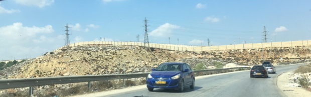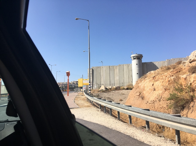 Was sich verändert, ist der Zustand der Straße – sie ist kaputter, holpriger – und die Autos: Jetzt sehe ich zum ersten Mal welche mit weiß-grünem Kennzeichen. Als nächstes erblicke ich die Mauer: plötzlich ist sie da, vielleicht 100 Meter von uns entfernt, und zieht sich eine Weile entlang unserer Strecke. Dabei verändert sie ihr Aussehen: graue Betonplatten, dann Zaun mit Stacheldraht, dann hellroter und gelber Backstein. Ich verstehe offen gesagt nicht genau, was sie hier abtrennt, denn auf der einen wie auf der anderen Seite scheint nur unbewohntes Land zu sein. Manchmal kommen wir an Ortschaften vorbei; noch sieht alles gleich aus für mich. Meine Begleiterin erklärt mir: Die palästinensischen Orte erkenne ich daran, dass auf allen Häusern große schwarze oder weiße Wasserkanister stehen, da die Wasserversorgung in den palästinensischen Gebieten nicht immer gewährleistet ist. Durch diese Information beginne ich die Gliederung der Landschaft zu verstehen: die Orte mit den Häusern mit schrägen Dächern und ohne Wasserkanister sind israelische Siedlungen. Dadurch ergibt auch der Verlauf der Mauer einen Sinn, sie trennt die Siedlungen voneinander ab, teilweise mit großem Abstand. Auf mich wirken die israelischen Siedlungen wie eingezäunt, bis ich verstehe: es gibt Straßen, die die Siedlungen miteinander verbinden und ausschließlich von Siedlern befahren werden dürfen, und die so etwas wie eine Matrix bilden, die sich über die restliche Landschaft legt, zusammen mit ihr und zugleich abgetrennt von ihr koexistiert. Wir fahren durch eine Unterführung – über uns die Straße der Siedler, wir hier unten auf der Straße in Zone A, die kein israelischer Bürger betreten darf. Ich kann mir keine geographische, zweidimensionale Karte vorstellen, die die Koexistenz dieser zwei Ebenen abbilden kann. Man kann diesen Raum hier nur dreidimensional verstehen und angemessen repräsentieren, die Grenzen zwischen Innen und Außen verlaufen sowohl horizontal als auch vertikal.